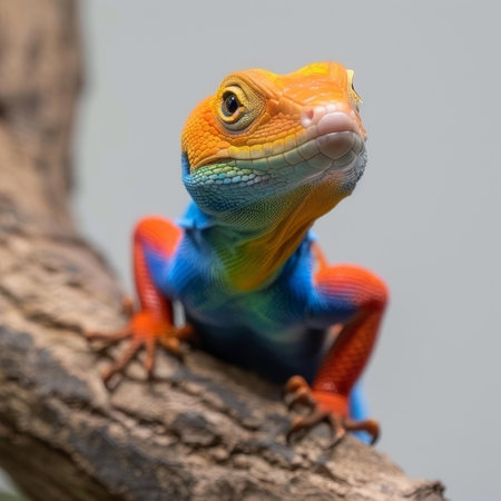 Colorful lizard is sitting on a branch. The lizard is orange and blue, and it has a curious look on its face