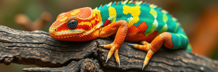 An AI generated illustration of A vibrant chameleon perched atop a tree branch, showcasing its bright colors