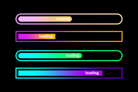 Loading bar set. Progress icons visualization. Loading status collection. Color bright lines. Gradient web design elements on dark backdrop. Vector illustration
