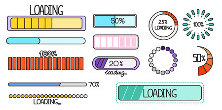 Loading bar doodle element set. Hand drawn line sketch style. Slow download speed, progress status, internet load bar concept. Isolated vector illustration.