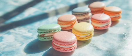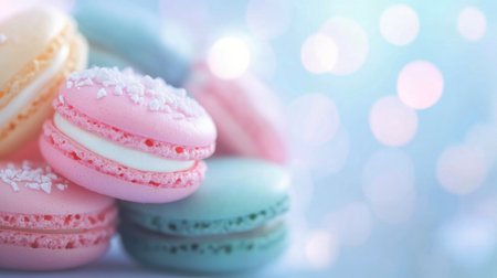 Delicious pastel-colored macarons in shades of pink, yellow, and green sit elegantly against a soft blue backdrop, creating a whimsical impression with sparkling highlights.