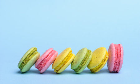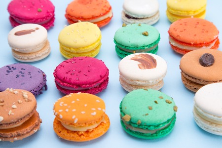 French dessert concept, Arrangement of colorful pastel macarons on light blue background.