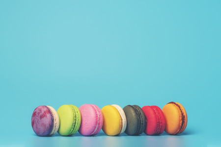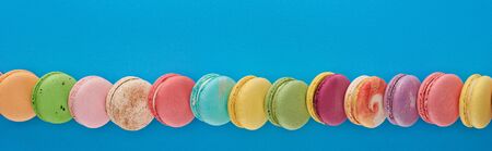 line of multicolored delicious French macaroons on blue bright background with copy space, panoramic shot