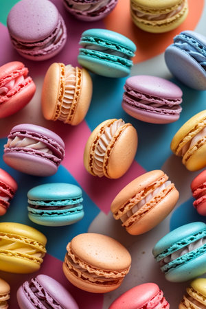 Colorful macarons arranged artistically on a vibrant background at a pastry shop