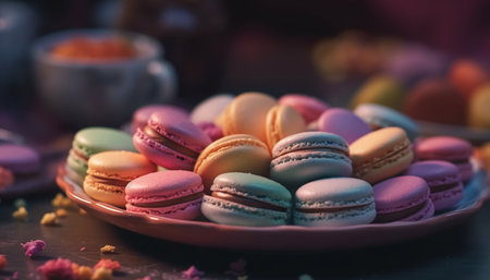 Multi colored macaroons stacked high on rustic table generated by artificial intelligence