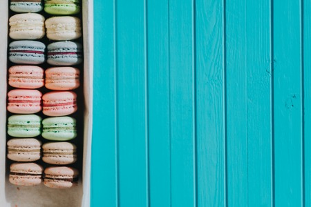 Cake macaron or macaroon on turquoise background from above, colorful almond cookies, pastel colors, vintage card