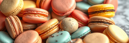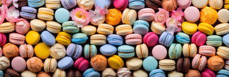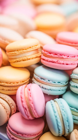 Top view of macarons in soft pastel colors. Colorful almond cookies. Generative AI illustration
