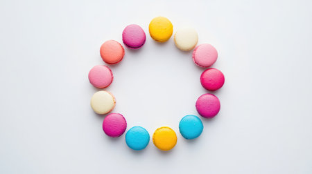 These colorful macarons are beautifully arranged in a circular pattern, showcasing a variety of vibrant colors. A perfect visual for desserts and sweets.