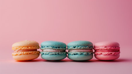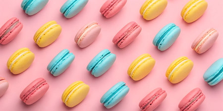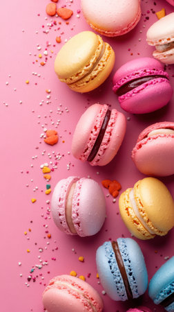 A delightful arrangement of colorful French macarons on a pastel pink surface, showcasing their delicate texture and inviting hues, perfect for sweet treat lovers.