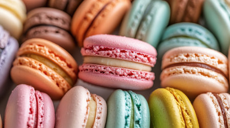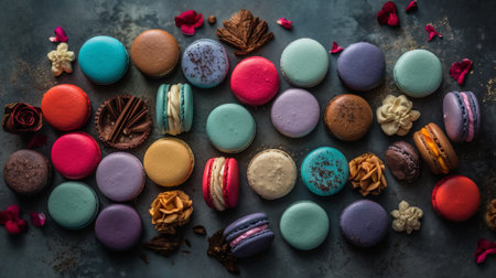 A vibrant collection of macarons in various colors and flavors is beautifully arranged, highlighting their delicate texture and artistic designs, perfect for dessert lovers.