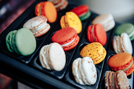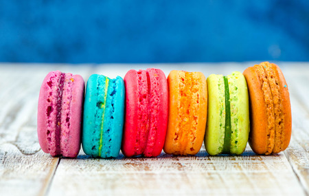 Delicious macaroons, a famous multicoloured French dessert in a row. Selective focus. Blurred background