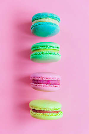 Sweet almond colorful pink blue yellow green macaron or macaroon dessert cake isolated on trendy pink pastel background. French sweet cookie. Minimal food bakery concept. Flat lay top view copy space