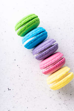 Colorful macarons on vintage pastel background. Macaron or Macaroon sweet meringue-based confection.