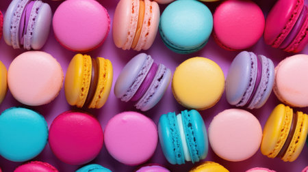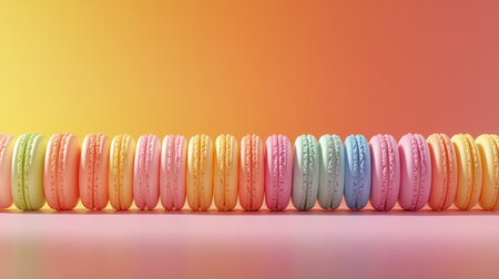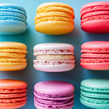 A delightful display of colorful macarons arranged in a row against a vibrant background, perfect for dessert inspiration, food photography, and showcasing sweet treats.