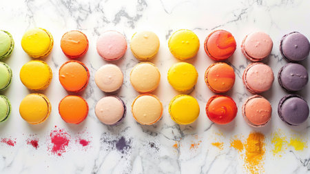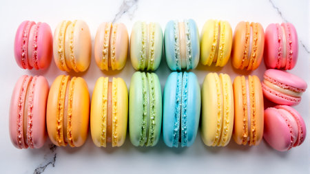 A beautiful display of colorful macarons in pastel shades sits on a marble surface. Each macaron showcases its unique hue, reflecting the craftsmanship of pastry preparation.
