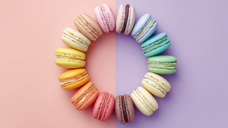 A stunning display of colorful macarons arranged in a circular formation on a soft pastel backdrop, showcasing their delicate textures and inviting flavors perfect for any occasion.