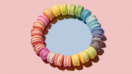 A vibrant circle of macarons arranged on a pink background showcases an artistic display of sweet flavors and colors, perfect for dessert enthusiasts and culinary art lovers.