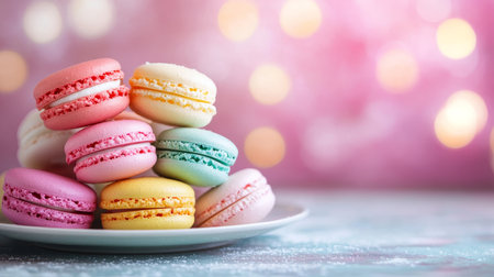 Colorful macarons stacked on a plate, set against a soft, blurred background for a dreamy look