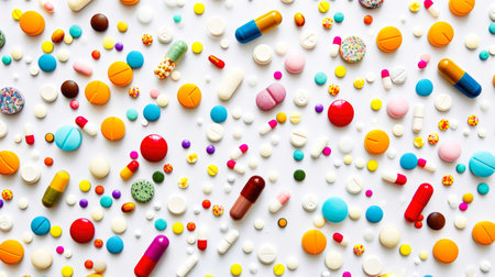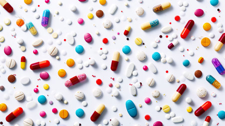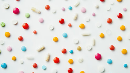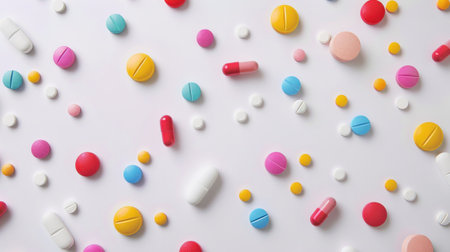 Colorful pills scattered on a white surface in a medical flat lay arrangement with top view perspective