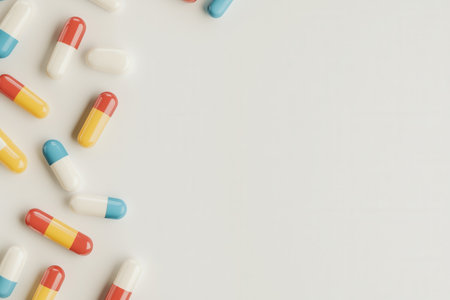Brightly colored capsules are scattered across a plain white surface, highlighting a medical theme with attention to detail and composition.