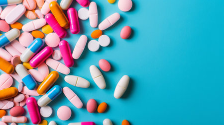 Vibrant mix of pills, capsules, and tablets on a colorful background, perfect for themes of health, medicine, and wellness in marketing and advertising.