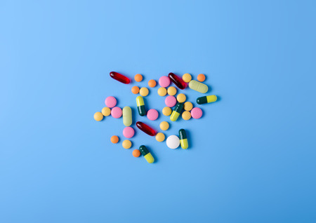 A lot of multicolored pills and capsules on a blue background as a concept of addiction from medicine. Vitamins to keep immunity on a high level.