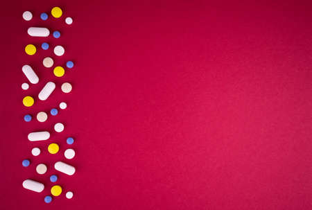 Colorful medication and pills on white surface with space for text and image for medical concept