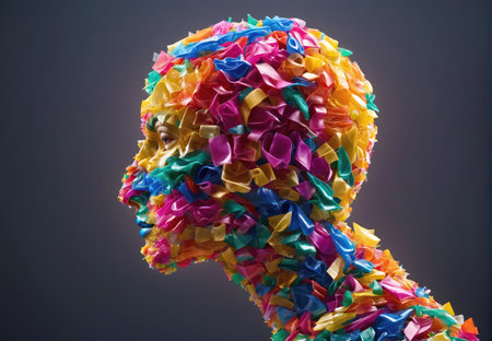 A close-up view of an abstract human head sculpture, featuring a mosaic of vibrant, multi-colored geometric shapes and patterns, representing complexity and diversity.