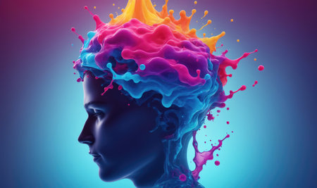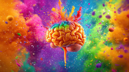 Vibrant image of a 3D brain surrounded by a colorful explosion of paint. The colors are bright and dynamic. The brain appears to be bursting with creative energy.