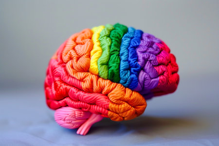 A colorful brain made of yarn. The colors are bright and vibrant, creating a cheerful and playful mood. The brain is a unique and creative representation of the human brain, showcasing its complexity