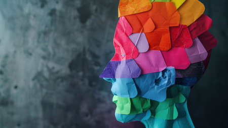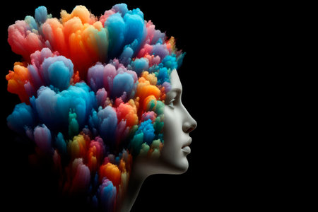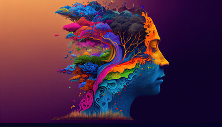 An artistic representation of a human profile featuring vibrant colors and symbolic elements. Inside the head, a wave, sun, and a representation of a brain are visible. The composition uses bright colors and textures against a dark background, suggesting a concept relating to thought, creativity, and the mind. It is suitable for various commercial uses.