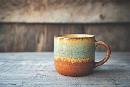 Colorful handmade ceramic mug standing on blurry background