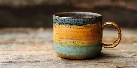 This ceramic coffee cup features earthy tones with shades of blue, vibrant orange, and rich brown, ideal for enjoying morning coffee or a soothing cup of tea during leisure moments