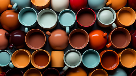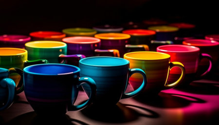 A vibrant collection of crockery in a row on table generated by artificial intelligence