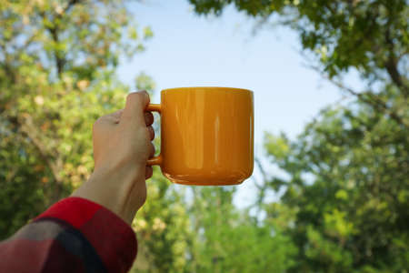 Female hand in shirt hold yellow cup outdoor