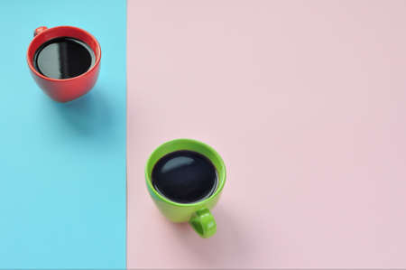 Two cups hot fresh coffee on bright pink blue brilliant paper. Food background. Top view. Flat lay. Minimalism
