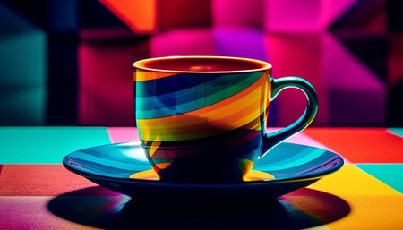 Multi colored coffee cup on blue table, no people indoors generated by artificial intelligence