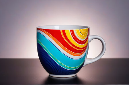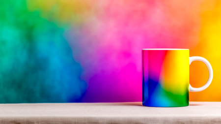 Rainbow colored mug standing on table with colorful background