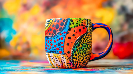 Colorful hand painted mug resting on table