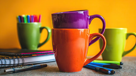 Colorful coffee mugs and pencils on a yellow background.