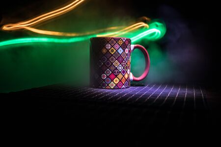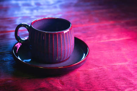 Coffee cup on the wooden table background in neon lights close up.