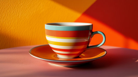 Bright striped teacup and saucer placed on a pastel surface, illuminated by warm sunlight casting shadows, evoking a cheerful and cozy mood.