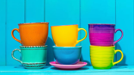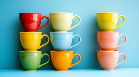 This image features a cheerful arrangement of colorful cups stacked high against a soft blue background, perfect for enhancing any kitchen or dining space with a lively touch.