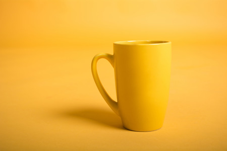 Empty yellow cup on yellow background. Yellow mug empty blank for coffee or tea.