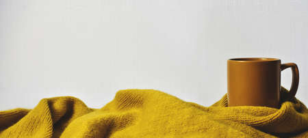 A cup wrapped in a warm knitted scarf. Winter home coziness concept