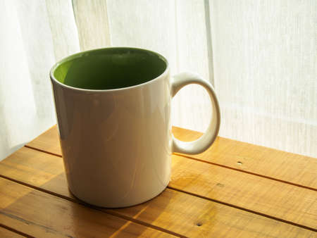 white mug on the wooden table near the window in the morning
