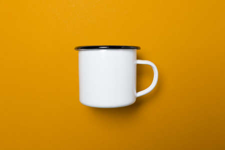 One white enamel cup with a black rim on a yellow uniform background, light an soft shadows, use es virtual meeting background or template