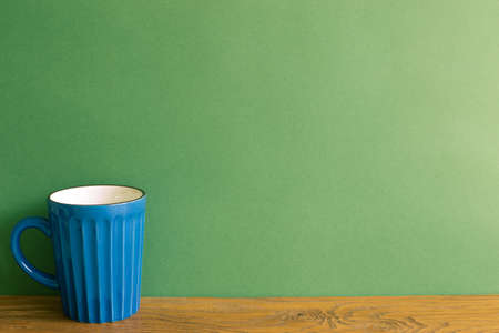 Blue mug cup on wooden table. green wall background. copy space