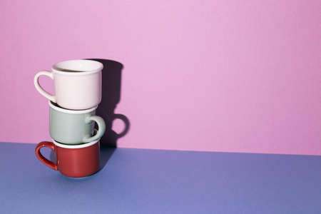 Stack of mug cup on blue table. purple wall background. copy space