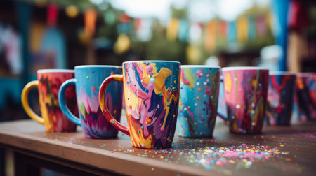 A row of beautifully designed ceramic mugs in various colors and patterns sits on a rustic wooden table, surrounded by a lively, artistic backdrop. The image captures the essence of creativity and warmth, inviting viewers to enjoy a cozy moment with friends over a cup of coffee or tea.